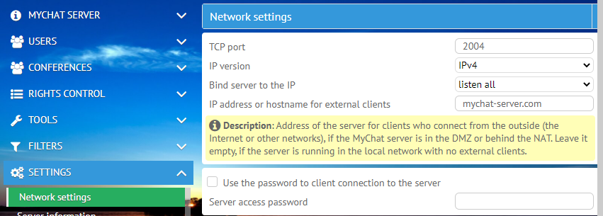 By default, right after the program installation and first start, MyChat Server automatically sets up the minimum of settings for its work. However, in this section, you can edit and configure them for MyChat work in your network.